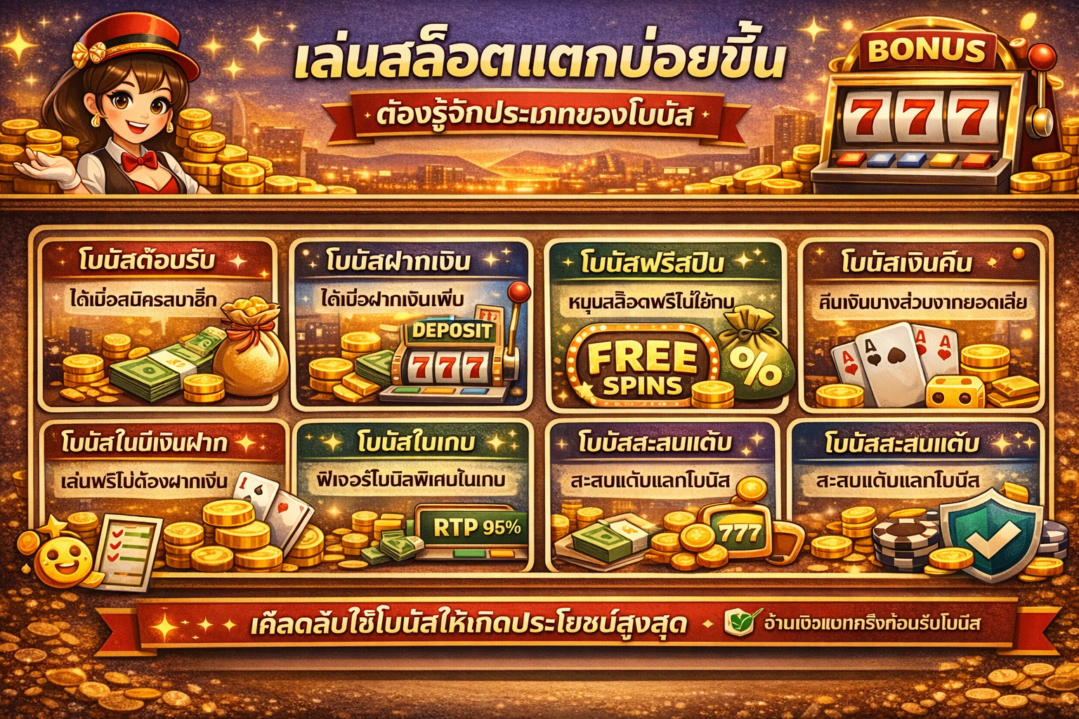 การเล่นสล็อตให้แตกบ่อยขึ้น ต้องเริ่มจากการเข้าใจประเภทของโบนัสอย่างละเอียด ทั้งโบนัสต้อนรับ ฟรีสปิน เงินคืน และโบนัสในเกม หากเลือกใช้ให้เหมาะสม จะช่วยเพิ่มโอกาสในการลุ้นรางวัล และลดความเสี่ยงในการเสียทุน สิ่งสำคัญที่สุดคือ เล่นอย่างมีวินัย วางแผนการเงิน และเลือกแพลตฟอร์มที่น่าเชื่อถือ เมื่อเข้าใจโบนัสอย่างถูกต้อง คุณจะเล่นสล็อตได้อย่างคุ้มค่า สนุก และปลอดภัยมากขึ้น